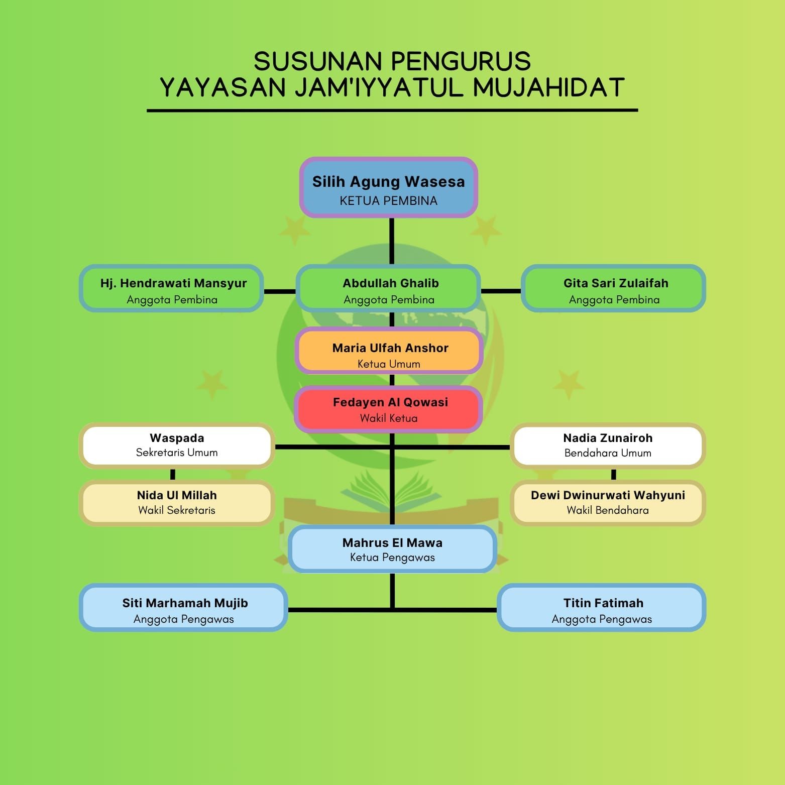 Dengan kepengurusan yang solid dan profesional, Yayasan Jam'iyyatul Mujahidat terus berikhtiar menjadi lembaga yang amanah dan bermanfaat luas bagi masyarakat.